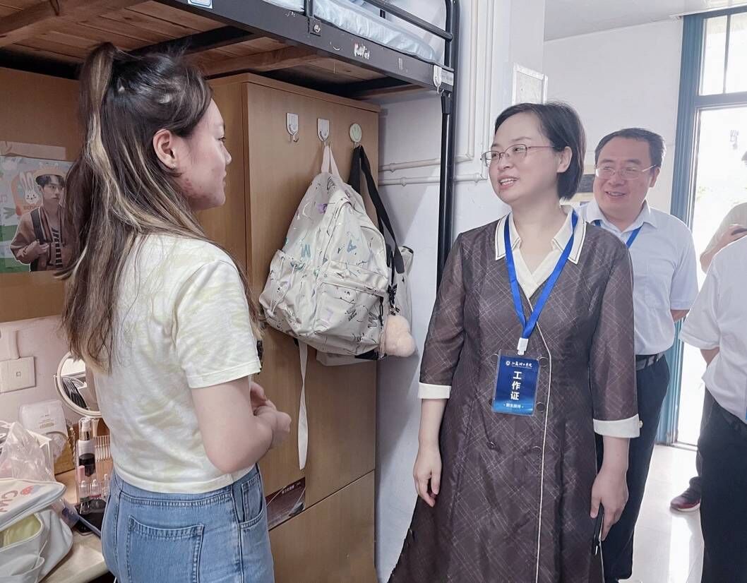 学校党政领导来到学院迎新现场亲切慰问,了解情况。学院领导班子在报到现场协调迎新工作,确保各项工作有序开展。校党委常委、副校长俞亚萍率学院领导班子走访新生宿舍,与新生和家长亲切交谈,并赠送象征平安喜乐的七彩葫芦香囊、外院手绘明信片等文创小礼品。