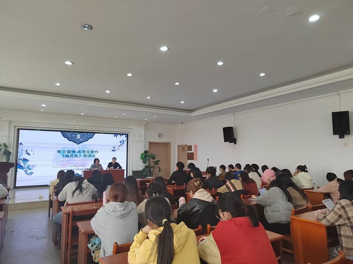12月6日,德国当代作家斯文蕾娜﹒库奇克(Svealena Kutschke)受邀来我院进行交流活动,在外语楼503报告厅举行其作品朗诵会。朗诵会由德语系刘卫平副教授主持并翻译,德语系师生和国际交流学院的部分德语外教共同参加了会议。