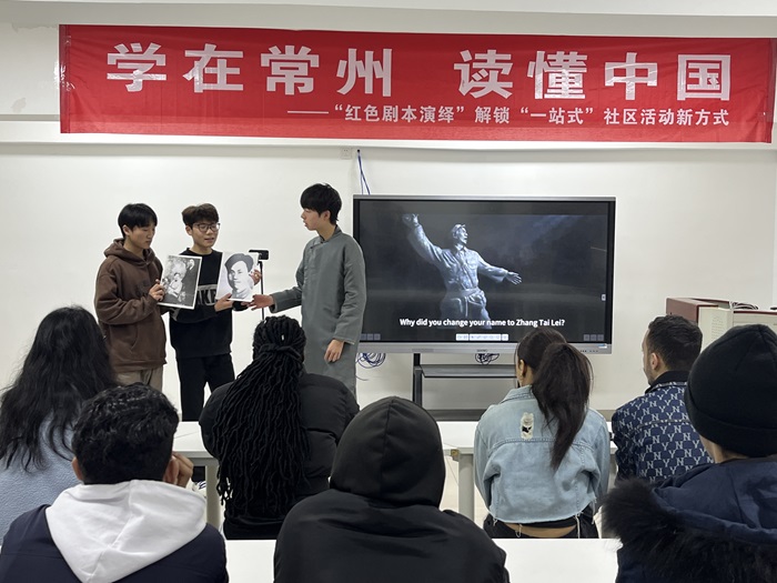 1月12日,在江苏理工学院博学“一站式”学生社区,外国语学院红色育英宣讲团的成员们正在为该校留学生演绎一场红色双语情景剧《常州三杰——张太雷篇》。