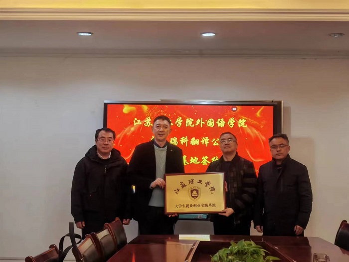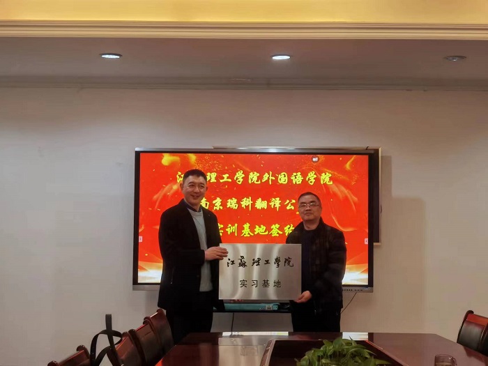 洽谈结束后,双方举行实习实训基地签约仪式。张鑫代表外国语学院向瑞科翻译有限公司授“江苏理工学院实习基地”牌和“江苏理工学院大学生就业创业实践基地”牌。双方表示,将以此次签约为契机进一步加强合作,实现合作共赢。(图文:潘学红;审核:李世存)