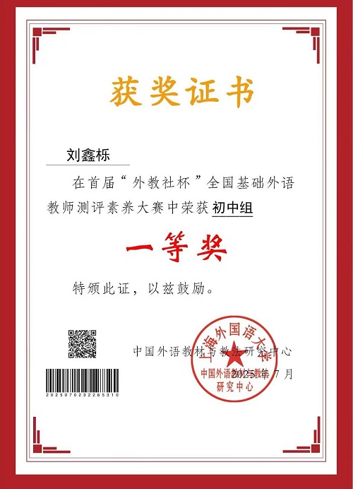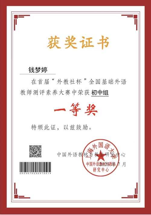 近日,由上海外国语大学中国外语教材与教法研究中心主办、上海外语教育出版社承办的首届“外教社杯”全国基础外语教师测评素养大赛圆满落幕。外国语学院英语系学子凭借充足的准备和出色的临场表现斩获佳绩,刘鑫栎、钱梦婷荣获初中组一等奖,陆心怡荣获初中组二等奖。
