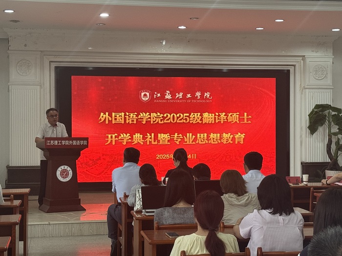 第一阶段为开学典礼。外国语学院院长张鑫首先致辞,热烈欢迎首批翻译硕士新生的到来。他介绍了学院简况,指出学院MTI培养目标为在人工智能时代背景下致力于培养具有深厚人文底蕴、扎实实践能力、开阔国际视野的高层次应用型翻译人才。研究生导师代表、外国语学院教授张德福发言,他分享了自己求学经历和感悟,期待研究生们主动践行“自信、努力、自律、感恩”的人生观和价值观。25研翻译1班刘路易作为新生代表发言,她表示以“厚德、博学、笃行”的校训作为自己研究生生涯的学习指南。