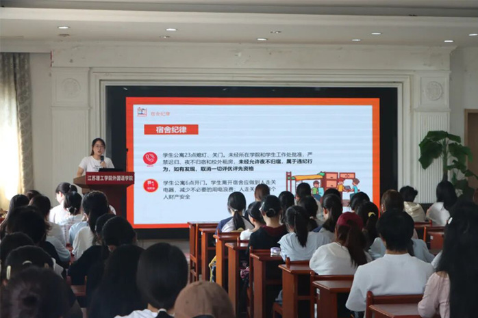 为进一步落实学校安全教育管理机制,增强学生安全意识和自我保护能力,加强新生宿舍管理规范,9月16日下午,外国语学院组织开展2025级新生宿舍纪律与安全专题教育。学生干部孔涵琳、马冰倩、林宇涵等担任主讲,内容围绕宿舍规章制度、安全教育、防电信网络诈骗等三个方面展开。