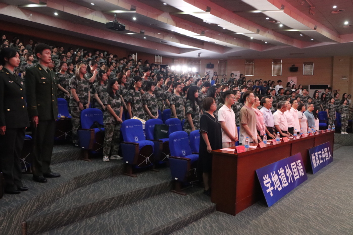 新生军训宣誓仪式中,在退伍大学生士兵、24英语3S班的颜炼和23商英1班的周梓钰的领誓下,全体新生举起右拳,用铿锵有力的誓言表达了不畏艰难、严格训练、遵守纪律的坚定决心。铮铮誓言,展现了新生们良好的精神风貌和不怕吃苦的决心。