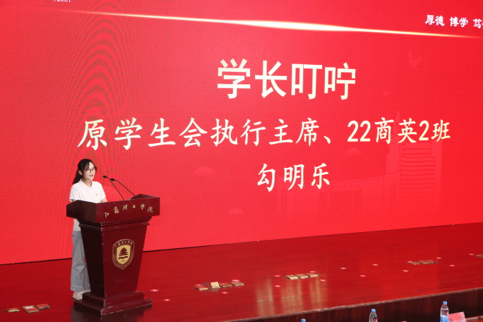 原学生会执行主席、22商英2班勾明乐作为老生代表发言。她从“过来人”的角度,分享了自己在校学习、实践和工作的经验与感悟,就如何适应大学节奏、合理规划时间、加入社团等方面给出了实质性的建议。