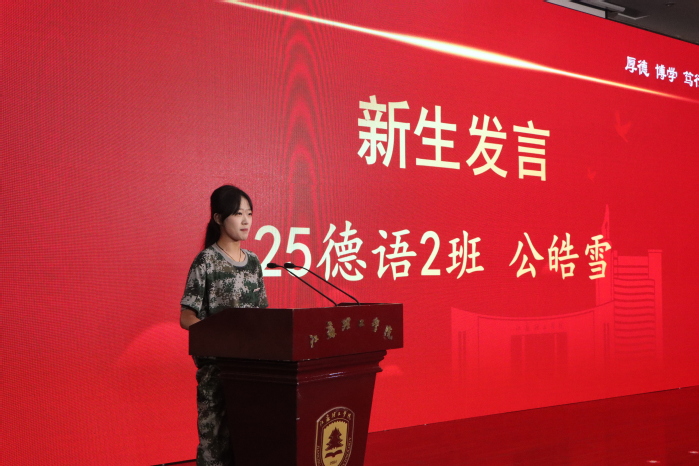 25德语2皓雪作为2025级新生代表上台发言。表达了对大学生活的无限憧憬和学业规划,并号召全体新生珍惜宝贵的大学时光,尽快适应新环境,积极参与活动,努力提升自我,不负时代、不负韶华,用奋斗书写无悔的青春篇章。