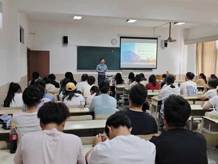 为助力学生深入了解翻译硕士开设院校,拓宽学术视野,搭建与高水平院校交流互通的平台,9月17日下午,外国语学院在50号楼305教室开展上海对外经贸大学翻译硕士招生宣讲会。本次讲座特邀该校国际商务外语学院副院长郭义主讲,以及我院2024届优秀毕业生、现就读于该校英语笔译专业的王昊宇同学分享升学、就读体验。外国语学院2022级、2023级意向考研学生到场聆听。
