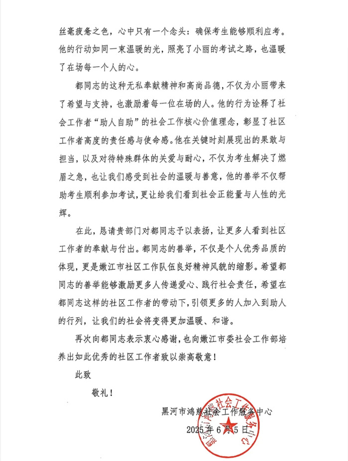 近期,嫩江市委社会工作部收到黑河市鸿慈社会工作服务中心发来的表扬信,信中对我市军民社区网格员都晓晨在2025年社会工作者职业资格考试现场的无私善举和奉献精神表示衷心感谢。