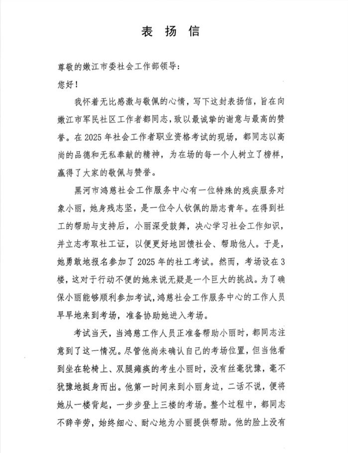 近期,嫩江市委社会工作部收到黑河市鸿慈社会工作服务中心发来的表扬信,信中对我市军民社区网格员都晓晨在2025年社会工作者职业资格考试现场的无私善举和奉献精神表示衷心感谢。