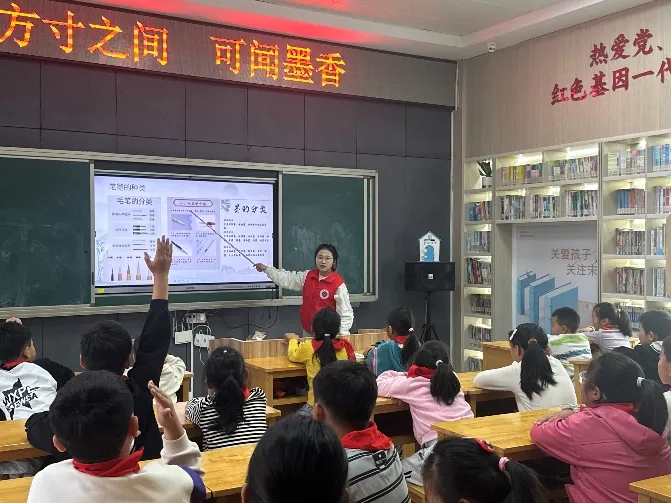 活动伊始,志愿者深入浅出地讲解了书法的发展历程及笔墨纸砚的种类。从先秦时期的起源到隋唐时期的巅峰再到现在的传承与创新,孩子们专注聆听,对书法悠久的历史产生了浓厚的兴趣。当介绍著名书法家及作品时,孩子们无不被灵动、洒脱的书法作品深深吸引,都纷纷表示对作品的喜欢。在书法知识竞猜中,孩子们积极参与,将活动推向了高潮。从“书圣”王羲之的“天下第一行书”《兰亭集序》到“亚圣”颜真卿的《多宝塔碑》,孩子们在竞猜中系统梳理书法知识,深化了对三千年书法史的认知。
