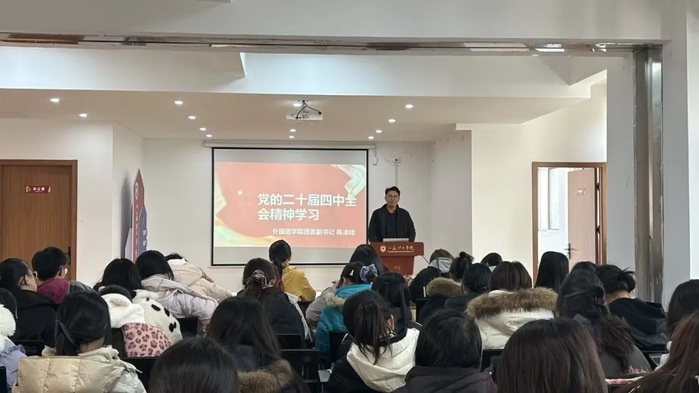 会上,陈凌峰领学党的二十届四中全会精神,他指出全会为国家未来发展指明了方向,干部要发挥思想引领作用,带动支部团员青年共同提升政治理论素养,将个人成长融入国家发展大局。要立足专业特色,争做中国故事的讲述者、中外文明的交流者,将外语能力转化为服务国家战略的优势。