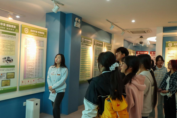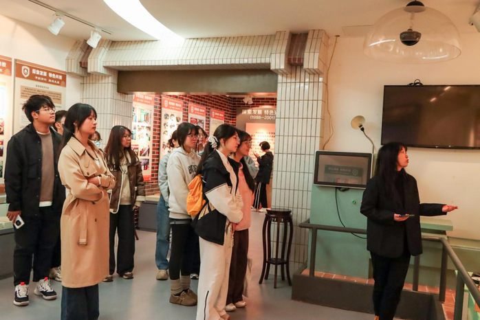 讲解过程中,讲解员们以时间轴+英语专业成长线为双脉络,沿校史馆历史沿革、办学成果、未来规划三大展区有序推进。尤其介绍了外国语学院从最初的英语专业、到如今4个专业并增设小语种辅修的建设历程。她们用双语介绍国家级教学成果奖奖牌、模拟车床等展品背后的故事,对照展示中外合作办学协议,她们特别列举了外院校友在国际学校英语教师、外事翻译、知名企业等领域的就业案例,让新生班委直观感受外语专业的职业前景。
