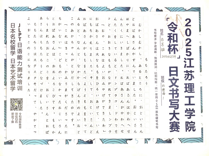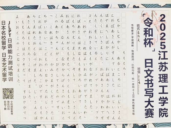 近日,日语系主办、和风社承办的2025年度“令和杯”日文书写大赛圆满结束。活动反响热烈,共吸引120人参赛,其中日语专业学生40人,非专业学生80人。