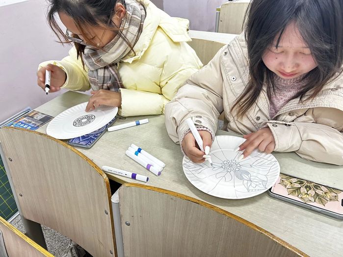 活动伊始,主持人对活动背景与流程进行了简要介绍。在随后的DIY创作环节中,同学们领取白色纸盘、水彩笔、贴纸等材料,围绕“曼陀罗”图案展开自由创作。现场氛围专注而宁静,同学们将内心的情绪转化为线条与色彩,不少参与者还结合专业所学,在作品旁用英语、日语、德语等不同语种写下表达情感的词汇或句子,赋予作品更丰富的文化内涵与个人情感。