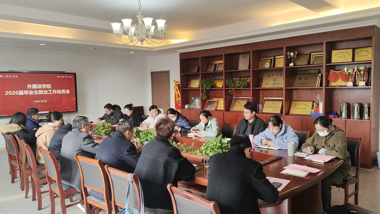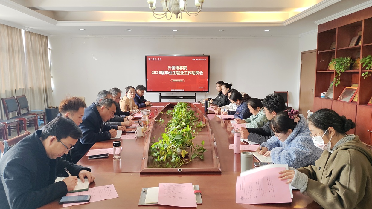 为全面推进毕业生就业工作,结合重要时间节点提前规划部署,帮助毕业生顺利就业,12月10日中午,外国语学院在50号楼210会议室召开2026届毕业生就业工作动员会。外国语学院党委书记王毅、院长张鑫、党委副书记兼副院长李晓曼、副院长李世存,2026届毕业班班主任及全体辅导员、各系主任参加会议。会议由李晓曼主持。