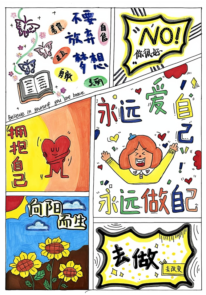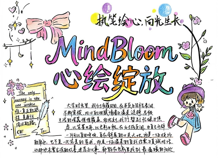 手抄报创作赛道中,同学们紧扣“MindBloom・心绘绽放” 主题,尽情挥洒创意,将文字与图画巧妙相融,勾勒出一幅幅鲜活出彩的作品。大家以斑斓画笔绘出心灵色彩,用真挚文字诉说内心感悟,生动诠释对心理健康的理解,传递出向阳而生、乐观向上的满满正能量。从这些作品里,能清晰看见同学们对生活的细致观察,更能感受到他们对内心世界的真诚探索与表达。