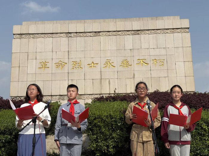 在庄严肃穆的烈士纪念碑前,全体师生整齐列队,奏唱国歌、集体默哀、敬献花圈,表达对革命先烈的深切缅怀与崇高敬意。