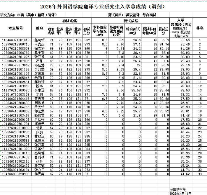 2026年外国语学院翻译专业研究生入学总成绩(调剂)